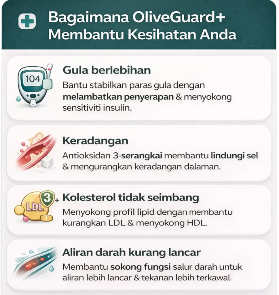 Raudhya OliveGuard+ Diperkaya Bahan Aktif Polyphenols, Tocotrienols (Super Vitamin E) & Omega Aktif Menyokong Kawalan Gula, Kolesterol & Tekanan Darah